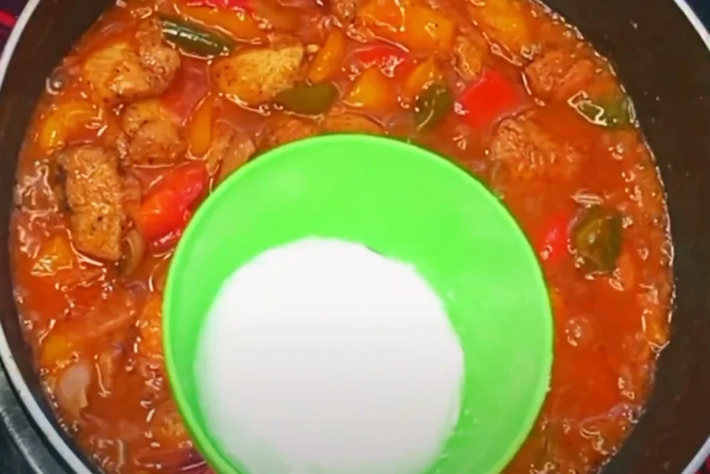 - Add some water, ½ cup of onion petals, ½ cup of yellow capsicum, ½ cup of red capsicum, chopped green chili, ¼ cup of frozen green capsicum, 4 tablespoons of tomato sauce, 1.5 tablespoons of soy sauce, salt to taste, and 1 tablespoon of black pepper. Mix all the ingredients.