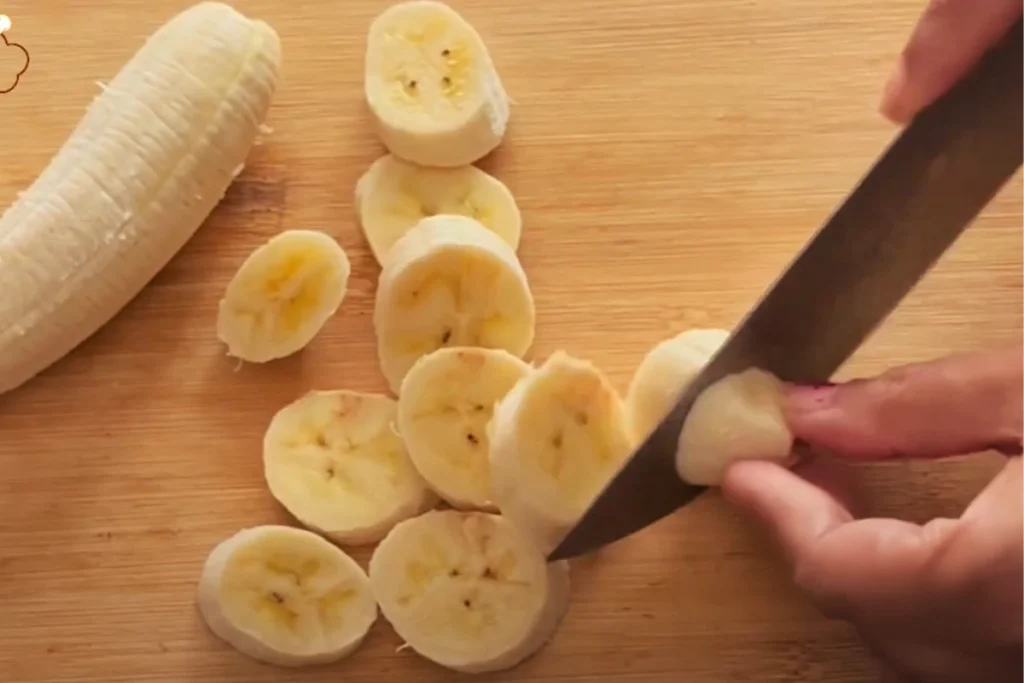- Now, you need to slice the bananas into even, round pieces and set them aside.