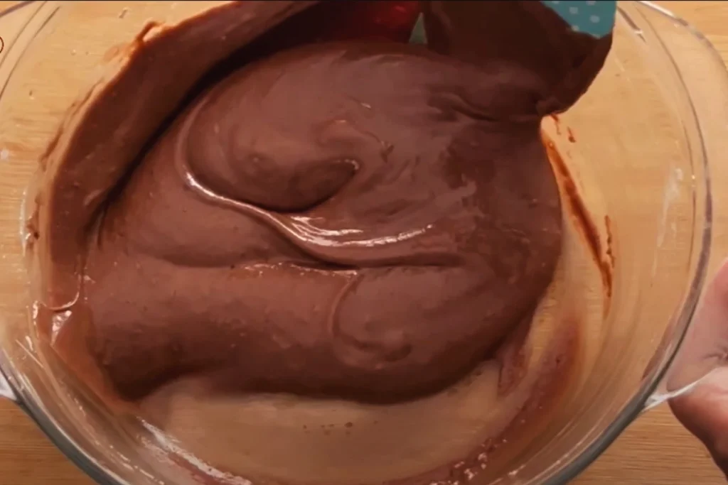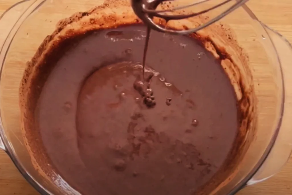 In a large bowl, whisk one large egg and ½ cup of sugar until the sugar dissolves and the mixture is smooth. Add ¼ cup of cocoa powder and mix until lump-free. Then, add ½ cup of flour, ½ teaspoon of baking powder, a pinch of salt, and ¼ cup of water, mixing until smooth.