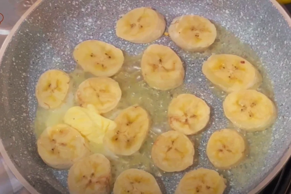- Let’s get back to the banana slices we set aside earlier. Place them in a small pan like the picture below. Add 1 tablespoon of butter to fry the banana slices for 1 minute.